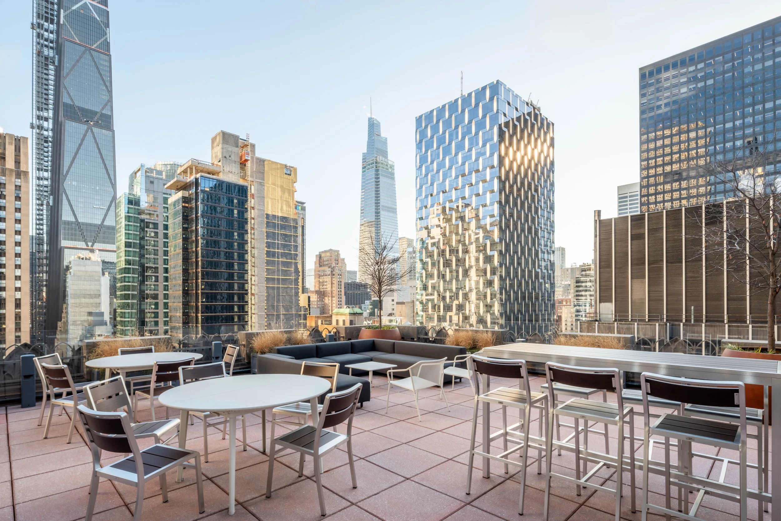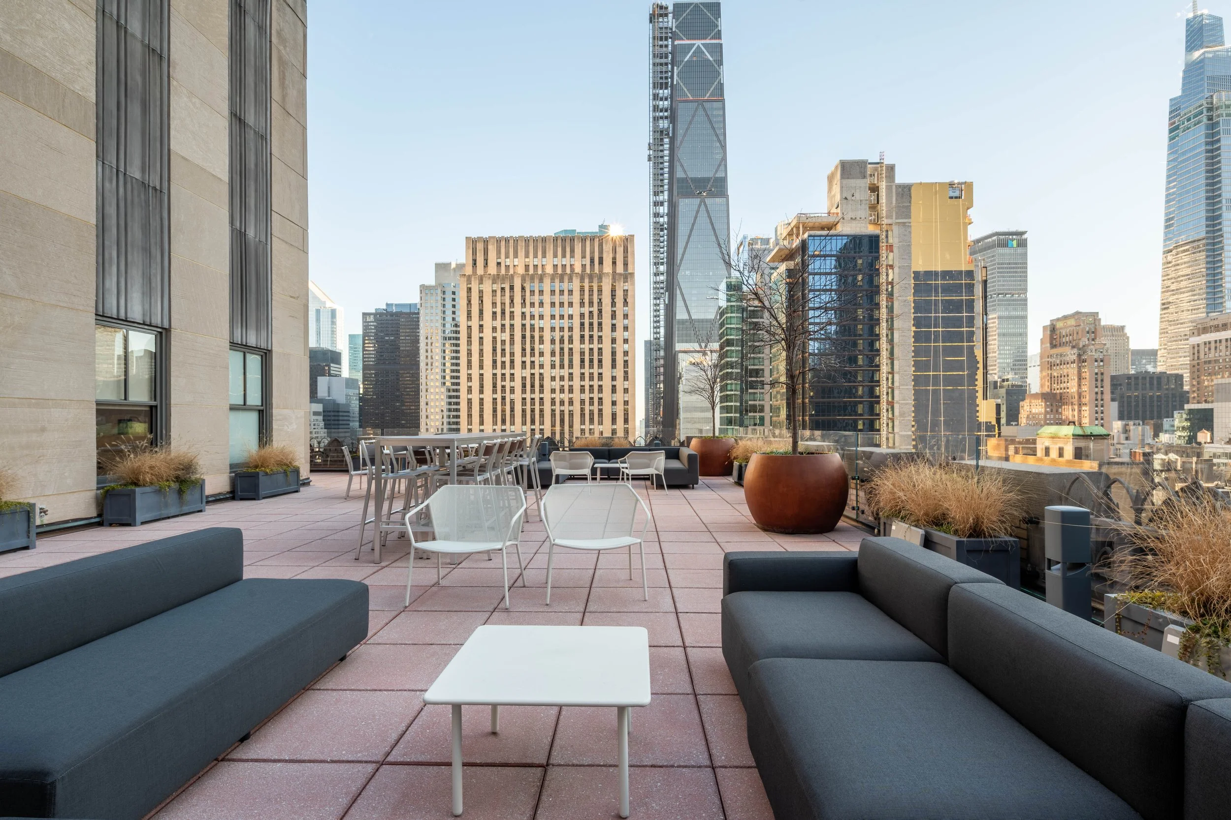 A welcoming lounge area highlights the warmth of exposed brick, natural light, and modern simplicity framing Rockefeller Center just beyond. The arrival experience is both elegant and approachable. A mix of light-toned finishes, soft seating, and layered textures create a professional yet comfortable environment.